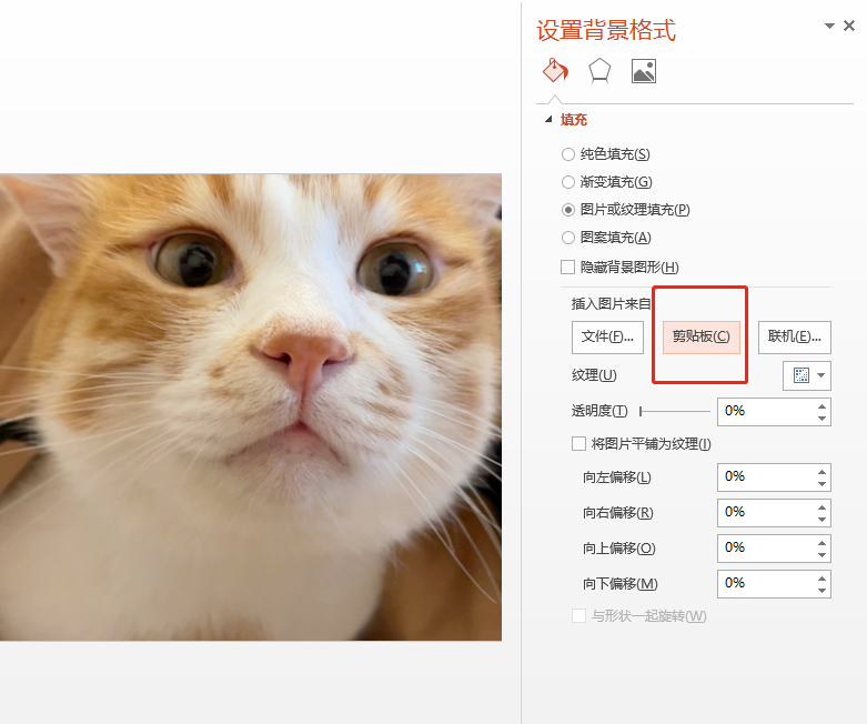 在设置背景格式对话框中,在【填充】选项下选择【图片或纹理填充】,在【插入图片来自】下选择【剪贴板】,即可将前面裁剪好的图片填充为幻灯片背景。