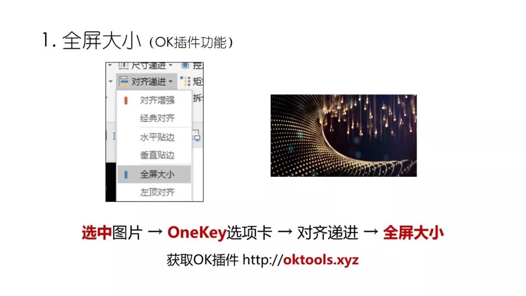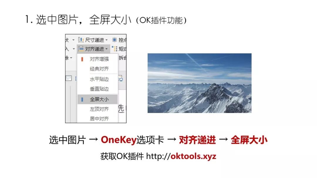 选中图片,点击OneKey选项卡→对齐递进→全屏大小,可以一键完成图片的全屏居中