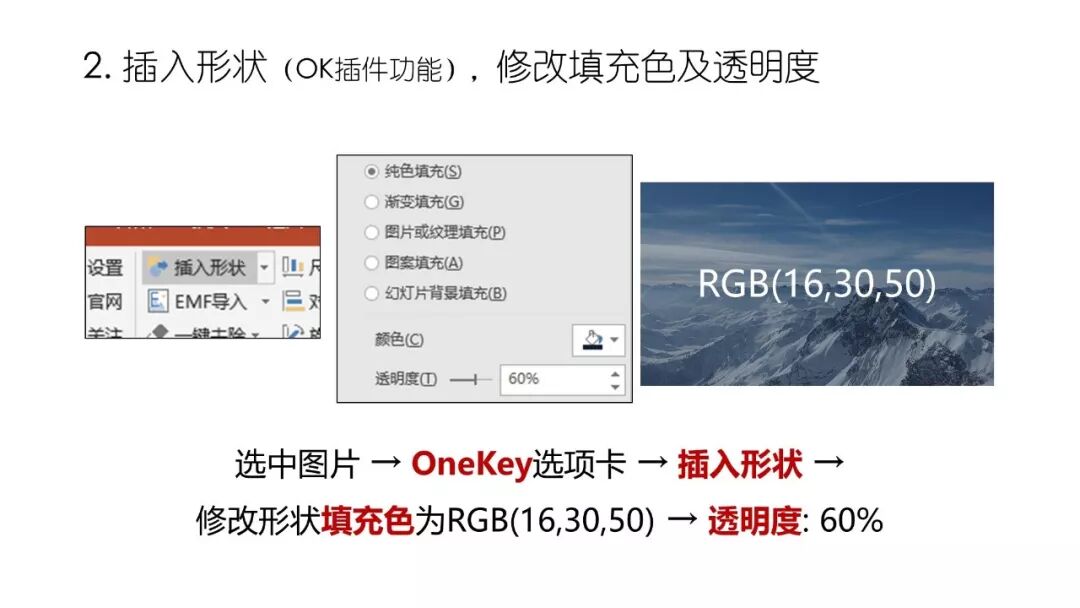选中图片,点击OneKey选项卡→插入形状→修改填充色→修改透明度