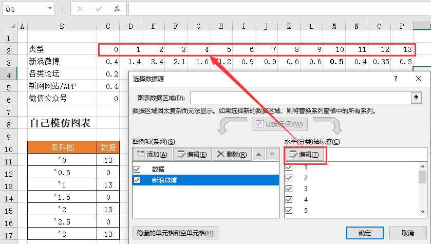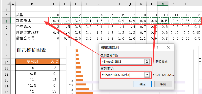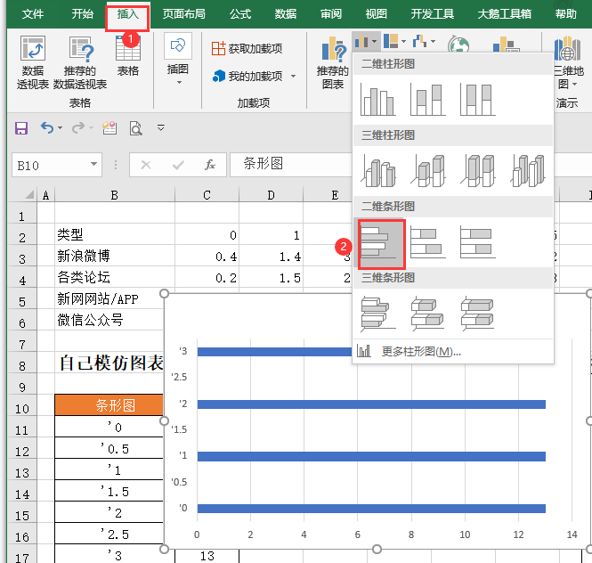 插入一个条形图,先准备一个虚拟数据,注意用文本格式表示位置(这里可以随便写)