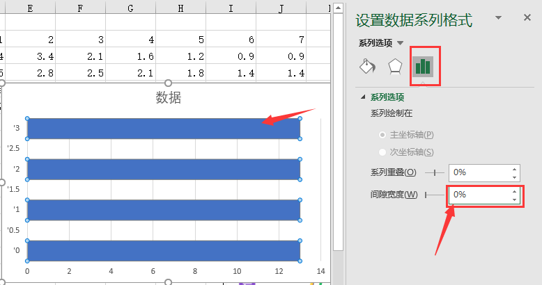 鼠标选中条形,然后选择图形设置,调整间隙宽度为0%