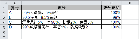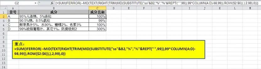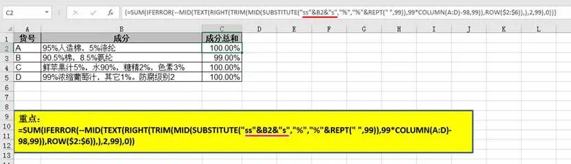 TRIM(MID(SUBSTITUTE("ss"&B2,"%","%"&REPT("",99)),99*COLUMN(A:D)-98,99)):在B2单元格加上两个ss,并在每个百分号%后面插入长度为99的空格;然后依次从第1、100、199、298处各提取长度为99的字符串,最后去掉提取的字符串中的空格,结果是{"ss95%","人造棉,5%","涤纶",""}。这段如果看不懂,可以看《Excel教程:用99个空格来提取单元格数据,你会吗?》