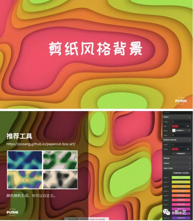 这是一个剪纸效果生成的网站,我们可以导入自己的图片,然后通过这个网站生成非常酷炫的剪纸背景。打开网站之后,我们可以在首页右侧设置它的各种参数。包括添加图片,剪纸的大小和数量,整体的颜色和风格等。