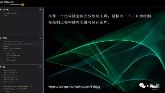 这款叫做Ribbons2的网页工具可以通过代码生成炫光图片,可以将他保存下来以后放到PPT里作为背景。