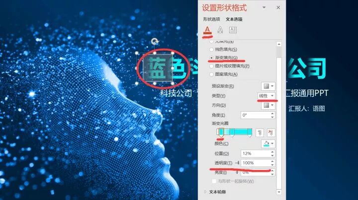 选中文字,右击选择设置文字效果格式。在文本选项中选择渐变填充。
