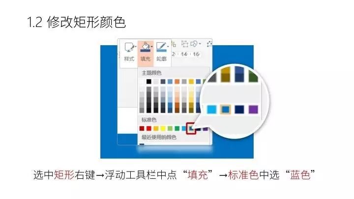 然后选中矩形,右键,在浮动工具栏中点“填充”,选择标准色中的“蓝色”