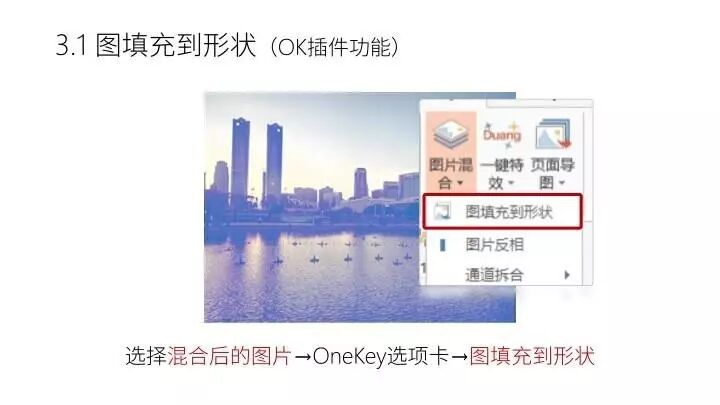 此时得到的图片可能颜色会很深,所以需要给图片加透明度。而在PPT中是不能直接调图片的透明度的,所以我们先使用OK插件的“图填充到形状”,把图片填充到形状中