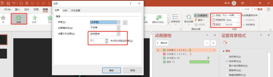 选中左边的文本框,添加一个【出现】的动画效果,点击效果选项,设置文本动画,文本动画选择【按词顺序】,0.1的延迟秒数。