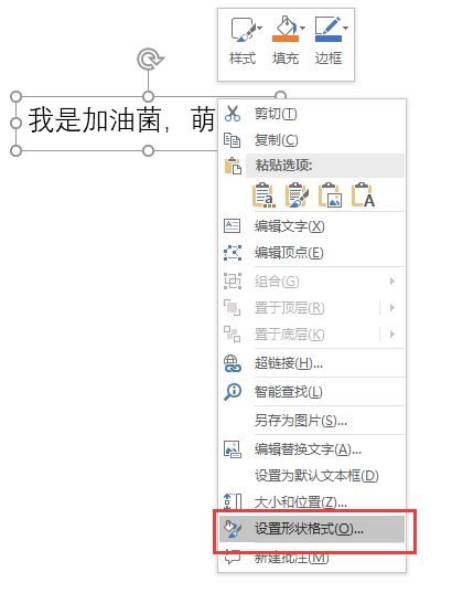 在文本框上单击鼠标右键,在弹出的快捷菜单中选择“设置形状格式”命令。