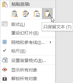 如果少量文字在粘贴时,可直接右键使用PPT中的“只保留文本”粘贴:
