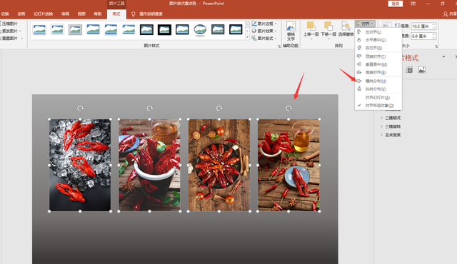 メ我们在PPT插入图片,点选图片——格式——对齐,让图片均匀分布展示。メ