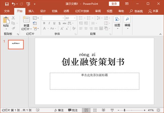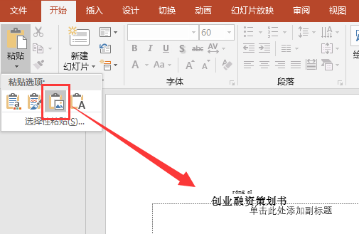 将文字添加上拼音后,选择并复制“创业融资策划书”文本,切换到幻灯片中,在“开始”选项卡中单击“粘贴”按钮下方的下拉按钮,在打开的下拉列表中选择“图片”选项,表示将剪贴板中的内容以图片的形式插入到幻灯片中。