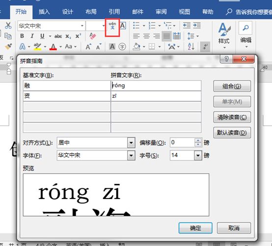 其实在PPT中是不能直接为文本添加拼音的,不过我们可以先在Word中输入相应的文本并为其添加拼音,比如这里在Word文档中输入“创业融资策划书”,然后将字体设置为华文中宋,适当增大字号,再选择“融资”文本,在“开始”选项卡中单击“拼音指南”按钮,在打开的对话框中设置拼音的对齐方式等参数,然后单击“确定”按钮。