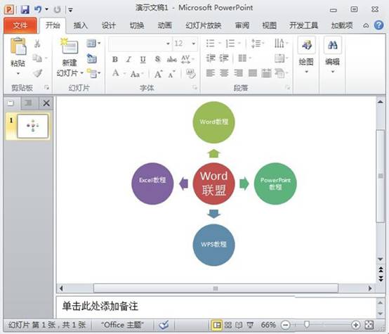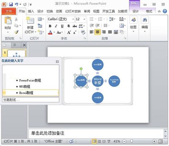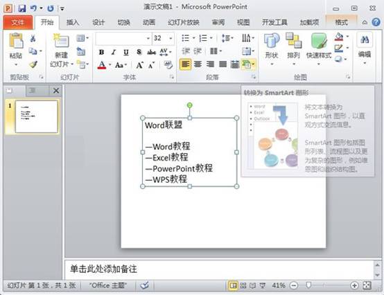 ① 打开PowerPoint 2010,编辑文字,选中文本框,单击开始菜单里面的转换为SmartArt图形按钮,如图1所示。