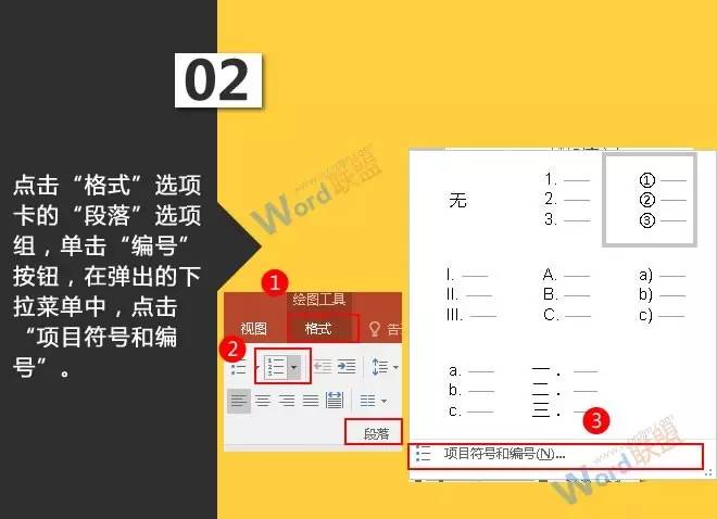 2、点击“格式”选项卡的“段落”选项组,单击“编号”按钮,在弹出的下拉菜单中,点击“项目符号和编号”。