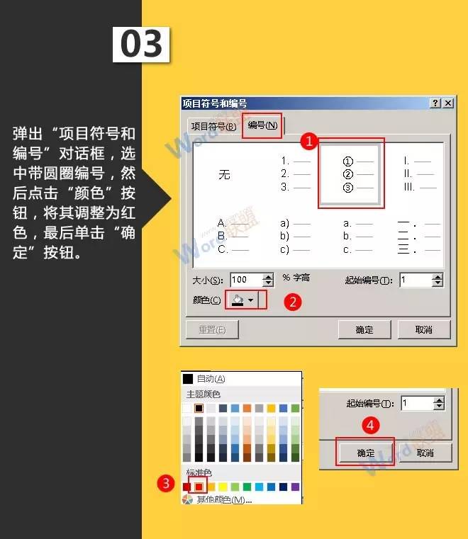 3、弹出“项目符号和编号”对话框,选中带圆圈编号,然后点击“颜色”按钮,将其调整为红色,最后单击“确定”按钮。