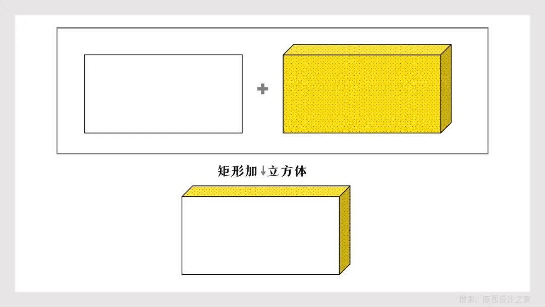 由一个白色填充黑色边框的矩形和一个图案填充的立方体叠加,得到的一个设计效果。