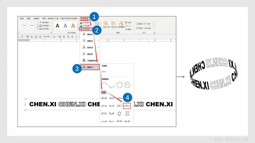 正常的文本框文字写好之后,我们点击形状格式→文本效果→转换→弯曲。