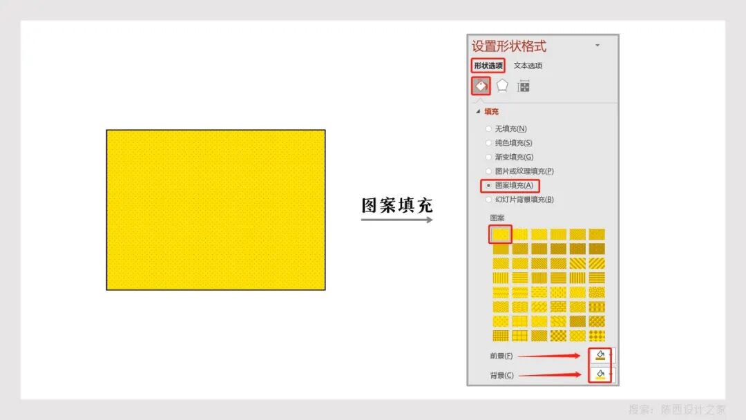 我们绘制好一个矩形,在形状选项的填充里面,可以找到图案填充,选择第一个图案。