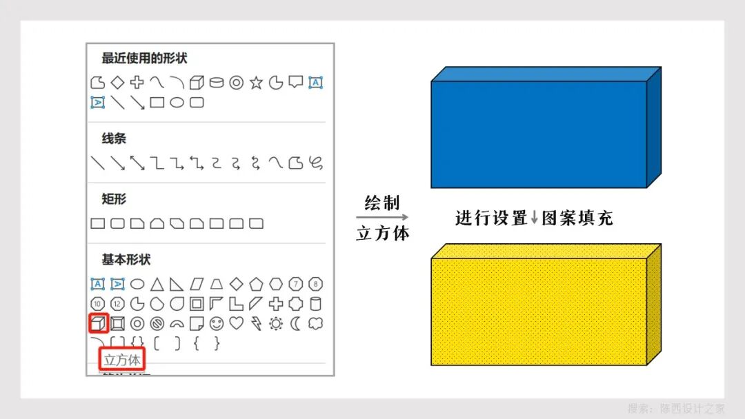这个立方体我们在PPT的形状里面是可以直接找到使用的。如下: