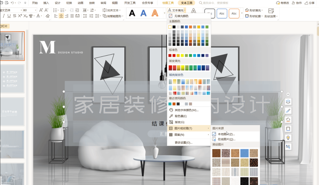 单击「文本填充」-「图片或纹理」,我们可直接在预设图片中选择图片的样式,也可以单击「本地图片」插入本地已有的图片。