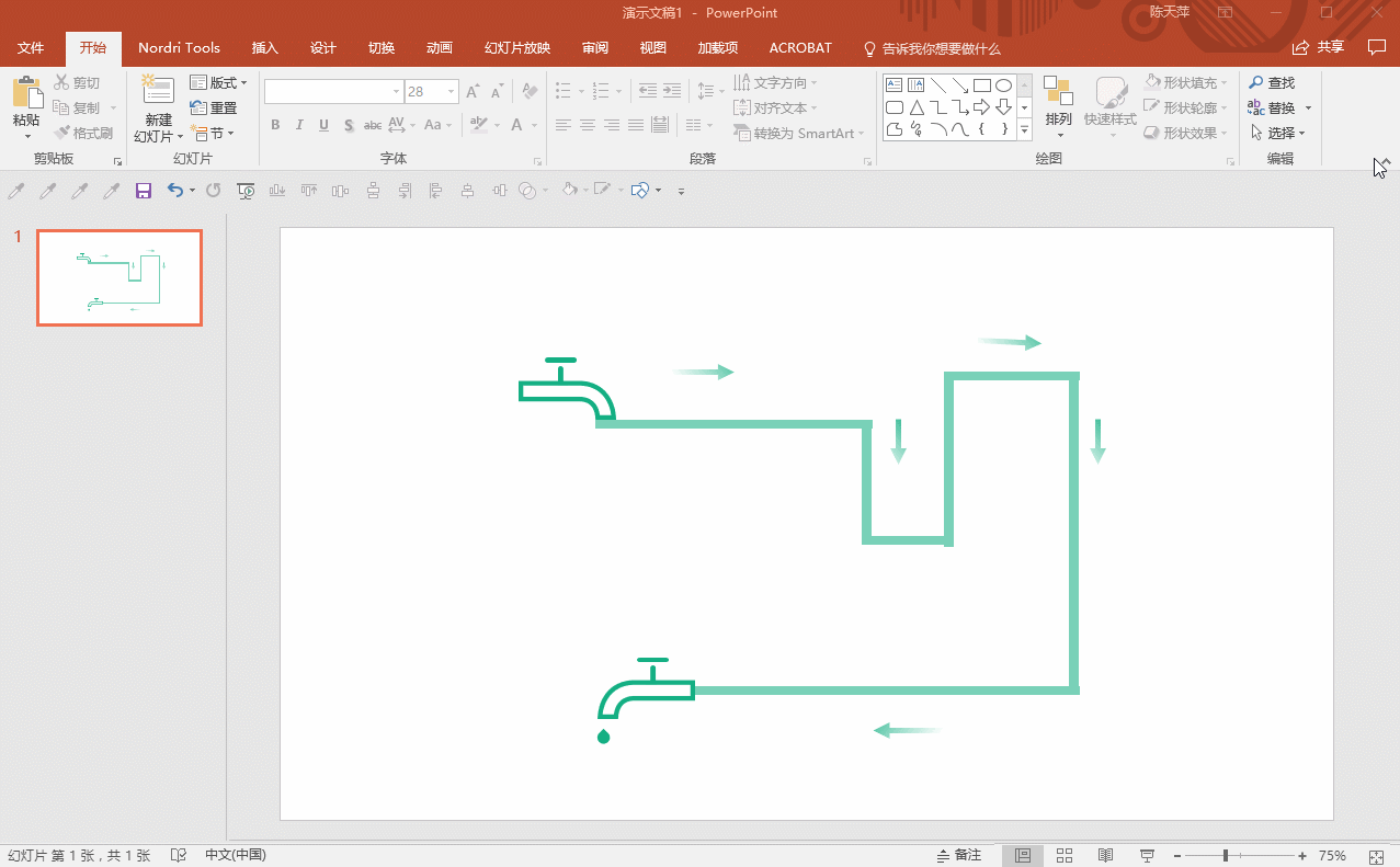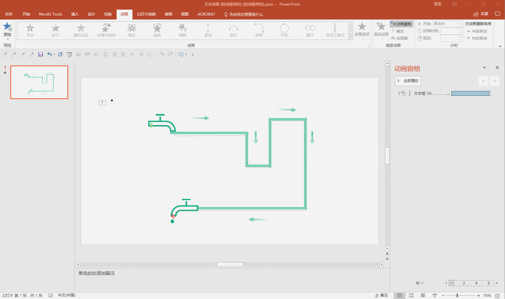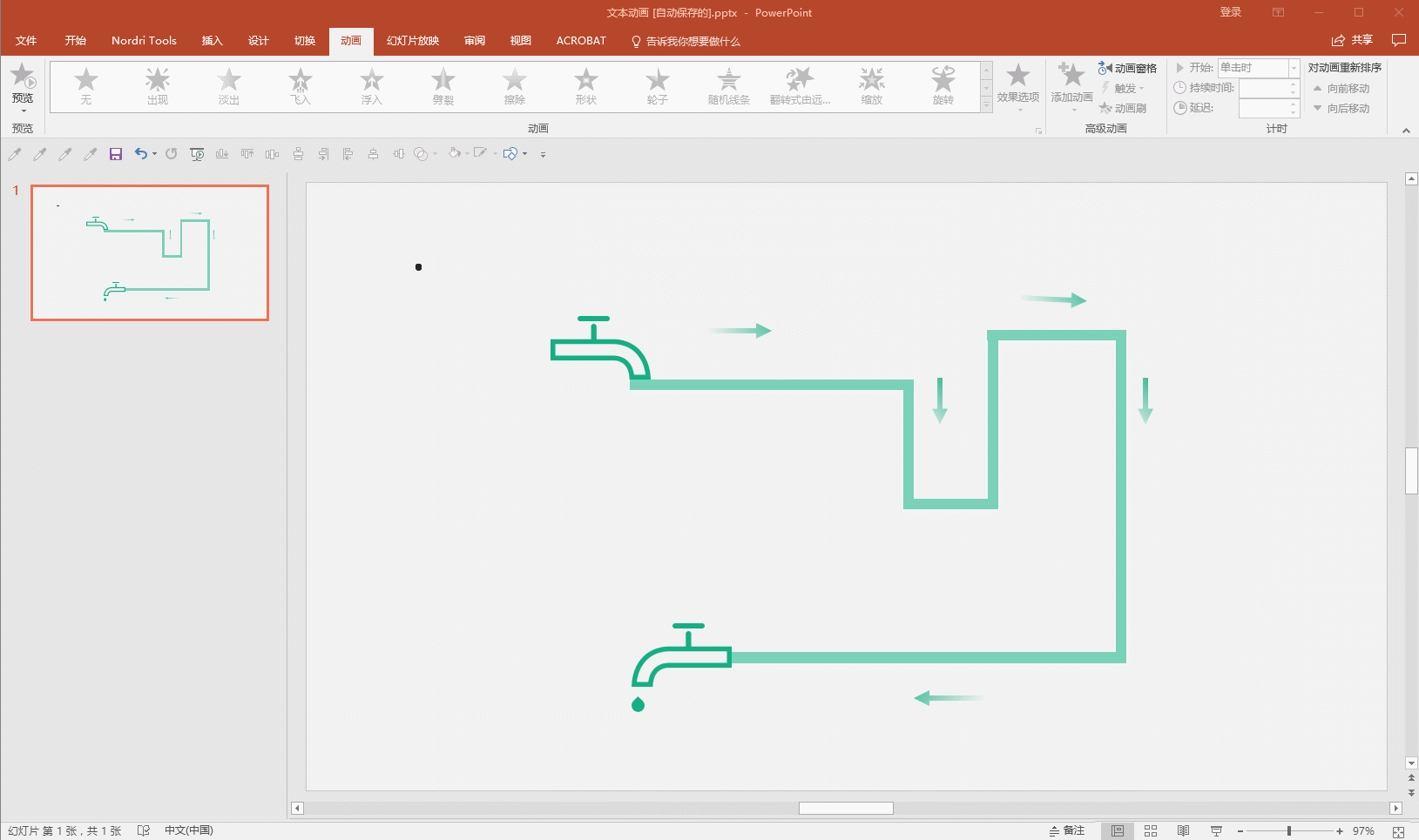 选中“点”(文本框)>【动画】【添加动画】【自定义路径】>沿着PPT页面中水管的方向绘制动画路径,绘制完毕后敲击回车键。且看下面的具体操作。