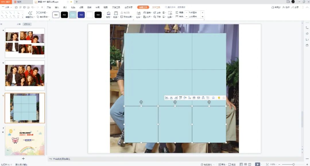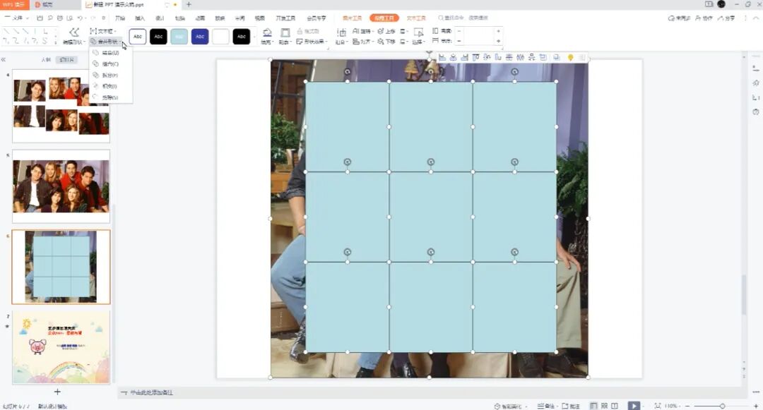 3、选择图片和九宫格,然后点击绘图工具的合并形状里的拆分。