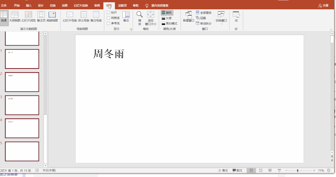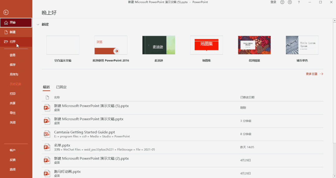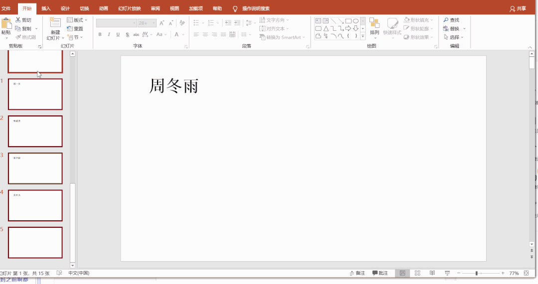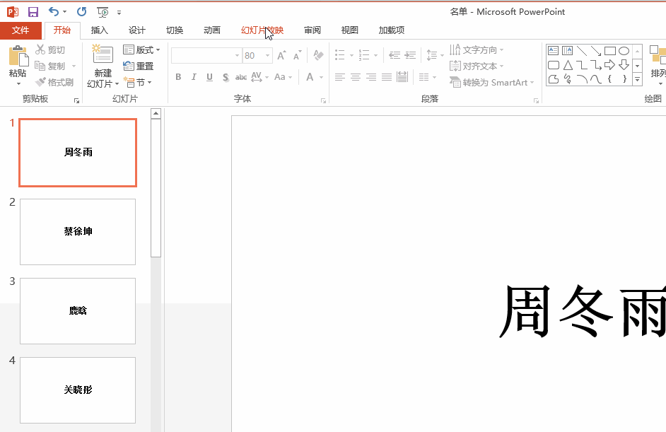 第二步:打开PPT,点击【文件】-【打开】命令,在打开的对话框中选择刚刚保存的Word文档,将其打开。此时,将自动新建一个演示文稿,同时,Word文档中的各个名字将分别放于各页幻灯片中。