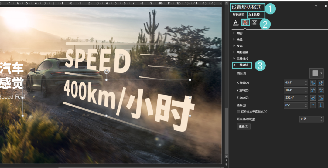 这里使用三维旋转功能:点击文本>右键设置形状格式>文本选项>文字效果>三维格式,具体的路径如下图所示:(也可以参考图中设置的数值)