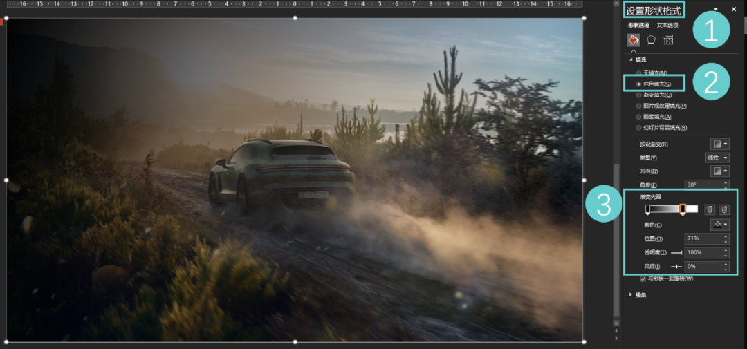 具体的操作路径是:插入形状>矩形>覆盖到图片上>右键设置形状格式>填充选项>渐变填充>修改透明度(如下图所示)