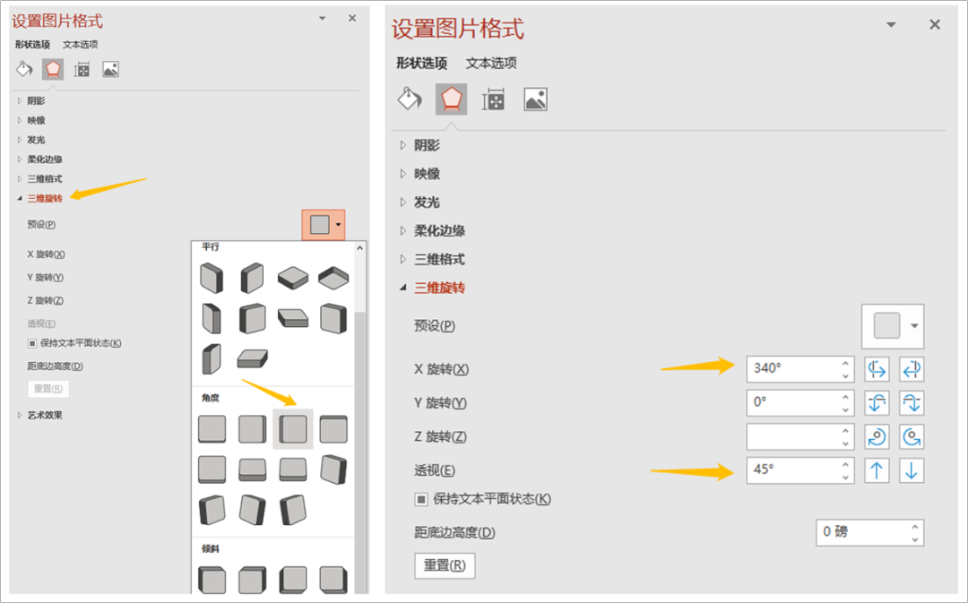 这里,我们在三维旋转里面选择恰当的角度还有透视就可以实现了。