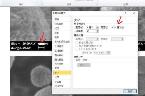 (三)加标尺。图片放大400倍左右,直至看清原图标尺,插入形状直线,并调整颜色为白色,调整粗细。点击右键设置形状的宽度数据,使其与原标尺一致,如果标尺长度不美观,可以等比例放大比例尺宽度,调整粗细。随后加入文本,写入对应的标尺,调整颜色为白色、加粗、字体设为Times New Roman。四张图的操作相同。