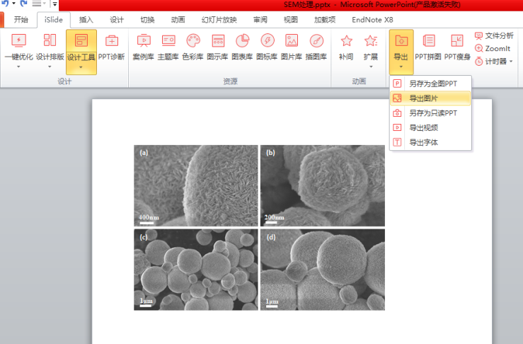 (六)最后,,,出片!!!点击islide插件→导出→导出图片,粘贴到Word文档中,裁剪掉多余的白边,至此,四张SEM图片排版完成。看到这里你学会了吗?如果感觉能帮到你,点个赞再走哦,要是有任何疑问或不清楚的地方,欢迎在公众号下留言。
