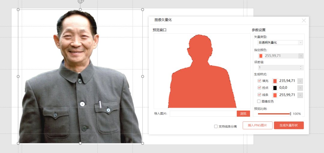 这里首先感谢我的好友:半,之前在公号文章里讲到的关于人物轮廓线条处理方法(这里需要用到一个插件PA口袋动画)然后将已经扣好的人物图片插入到PPT里面,同时找到创意图形功能——矢量素描进行处理生成矢量形状,然后我们在对人物形状进行渐变处理。