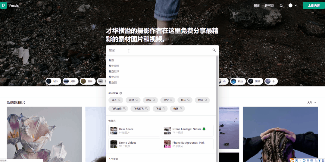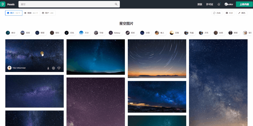 这是一个国外的图片免费分享网站,但是应该是架设了国内的服务器,访问速度很快。下载也很方便,有大量的优质图片。我们搜索星空看一下: