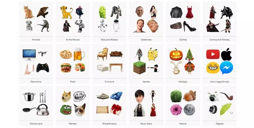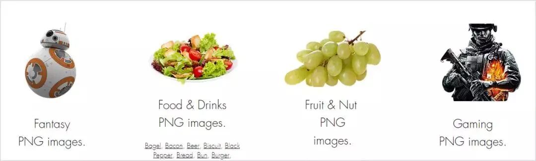 它提供各种分类,如动物、电影、人物、电子产品、食物等等,在里面可以轻松找到我们需要的一些png图片元素。