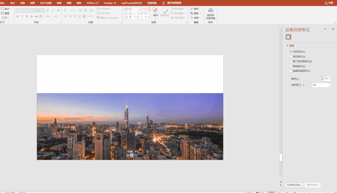 一般PPT画面容易留白,放置装饰PNG图时容易不好看,这时就可以设置一个有透明度的主题相关的背景图片了。
