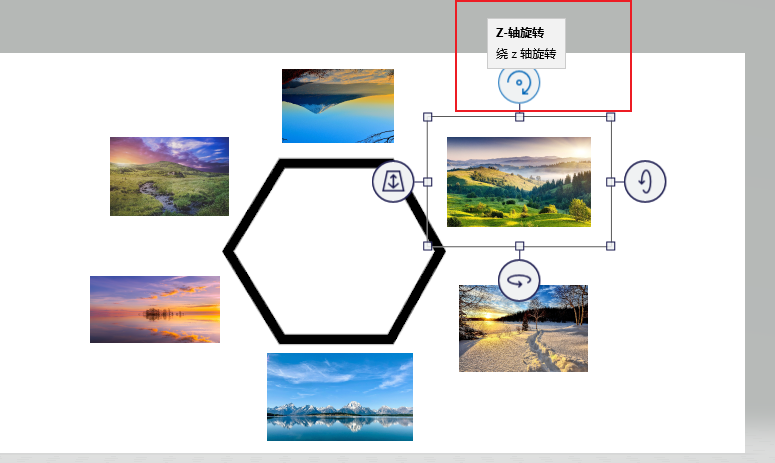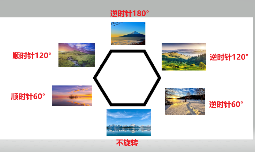 然后把所有图片选中,整体绕Z轴顺时针旋转60°,这样就可以把下一张图片旋转到底部