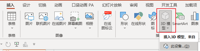 我们打开PowerPoint,选择插入3D模型,来自此设备