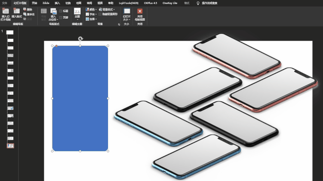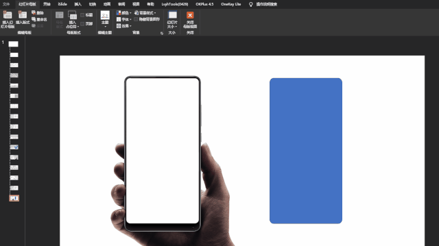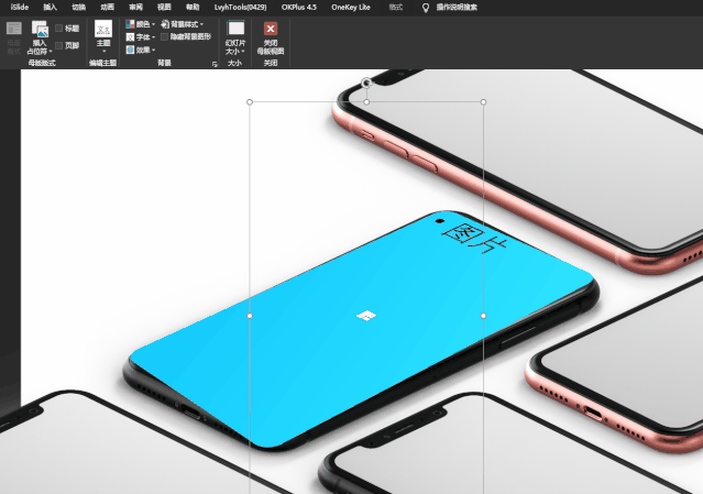 「幻灯片母版」中放入一个三维的手机样机,并插入一个「圆角矩形」