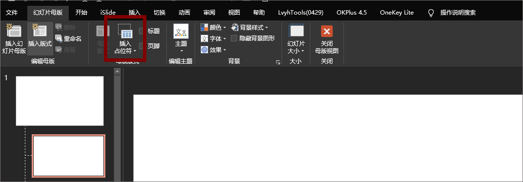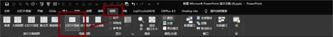 「占位符需要在「幻灯片母版里设计,点击「视图选项卡下的「幻灯片母版」。