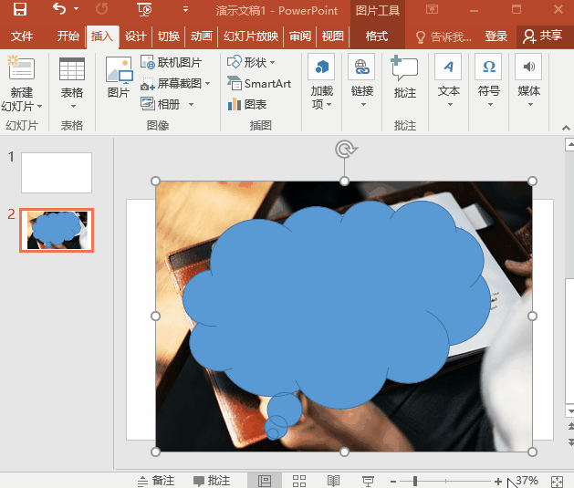 根据需要,你想要将图片裁剪成什么形状,就插入对应形状,这里以云形标记为例。