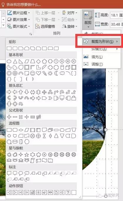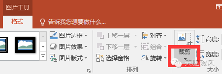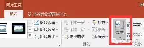 要实现这个功能我们只需要把图片插入PPT中,选中图片—图片工具—格式—裁剪: