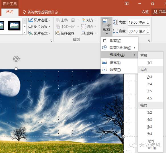 03当图片长宽比不是我们希望的值时,通过01的裁剪可以修改一定的长宽比,但是并不是标准的长宽比值,这个时候我们只需要选中图片—图片工具—格式—裁剪—下拉—纵横比