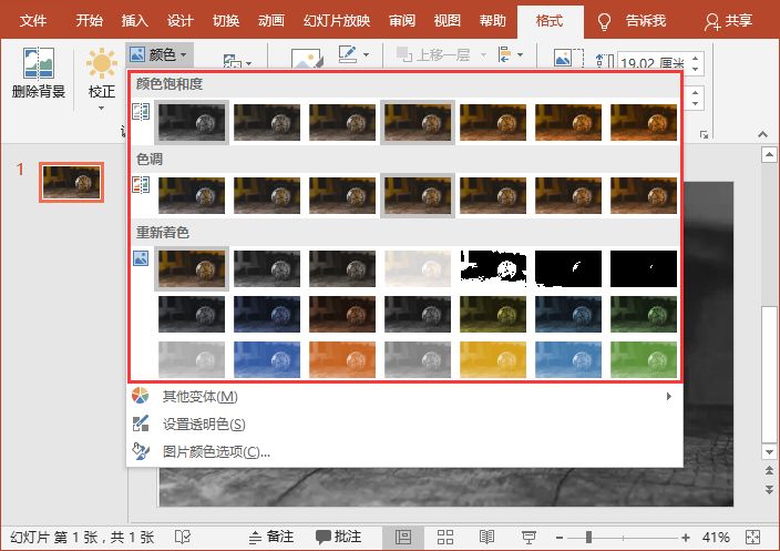 选中图片,点击【格式】-【调色】-【颜色】按钮,在弹出的列表框中将图片饱和度设置为0%,或者在重新着色栏中选择需要的颜色选项即可。