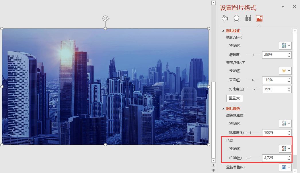 选中图片,点击鼠标右键,在弹出的快捷菜单中选择“设置图片格式”命令,打开“设置图片格式”任务窗口,选择“图片”选项卡,在”图片颜色“栏中找到“色调”,然后向左侧调整“色温”数值,图片即变为冷色调了。