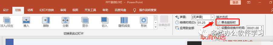 8、在换片方式命令组内取消勾选【单击鼠标时】勾选【设置自动换片时间】