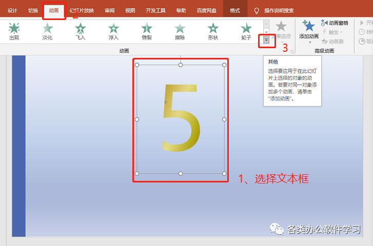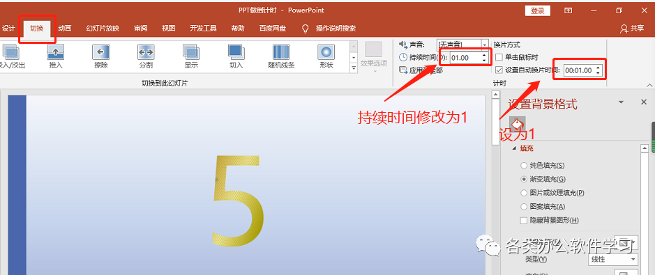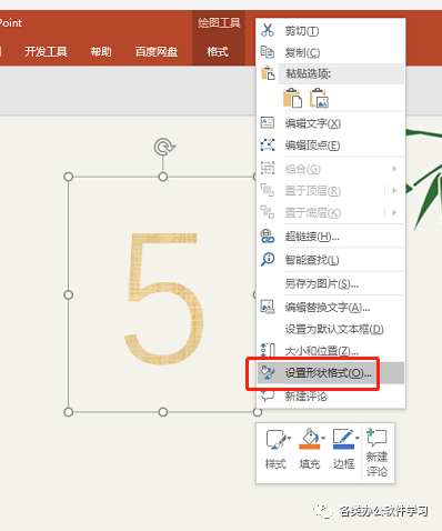 2、在文本框内输入数字5,并调整位置,使其居中在页面内,再选中该文本框,【右键】—【设置形状格式】