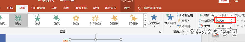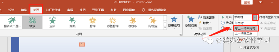 6、在【动画】选项卡下,开始里面选择【与上一动画同时】