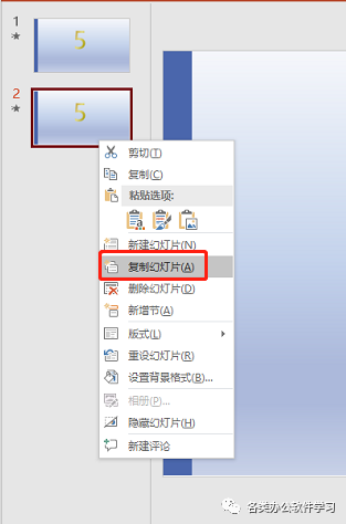 7、选择一个幻灯片后,【右键】—【复制幻灯片】复制四次,将后面几个幻灯片的数字修改为4,3,2,1